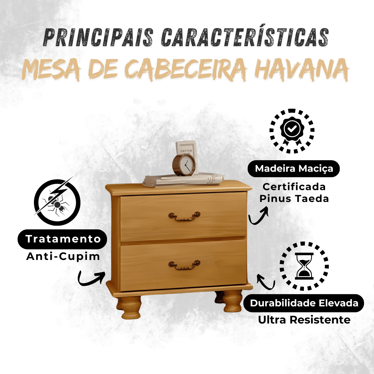 - Durabilidade e Resistência: Fabricada em Madeira Maciça de Reflorestamento Pinús Taeda, a Mesa de Cabeceira Cama Havana é robusta e foi feita para durar, resistindo ao teste do tempo.